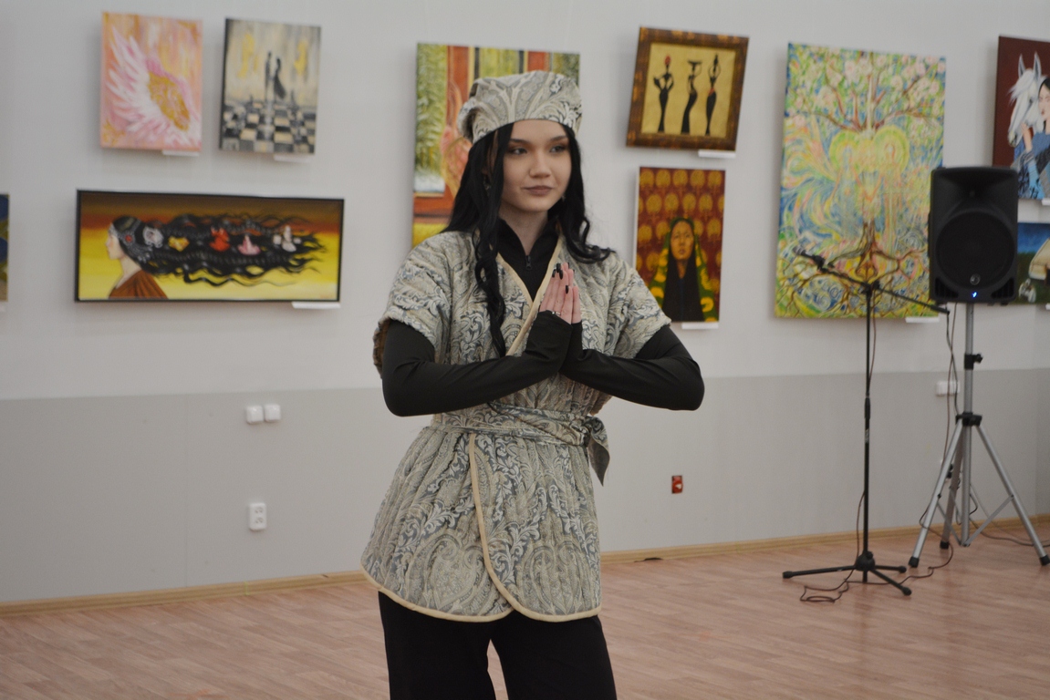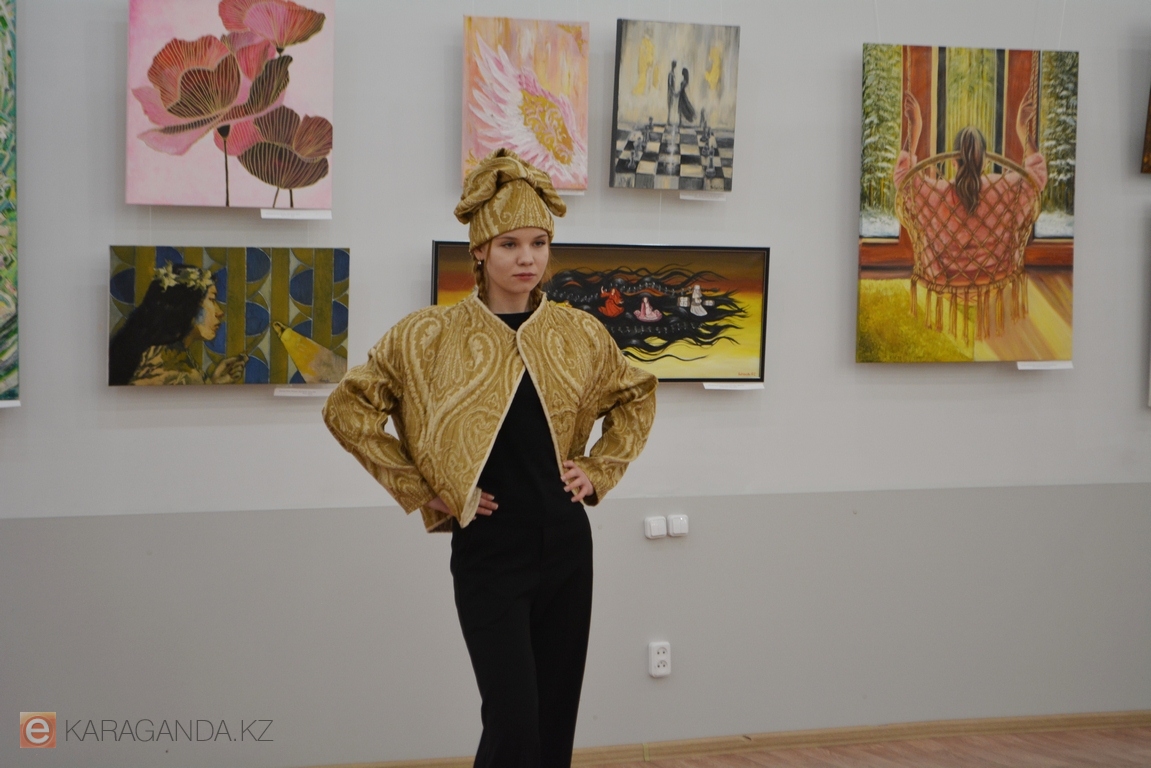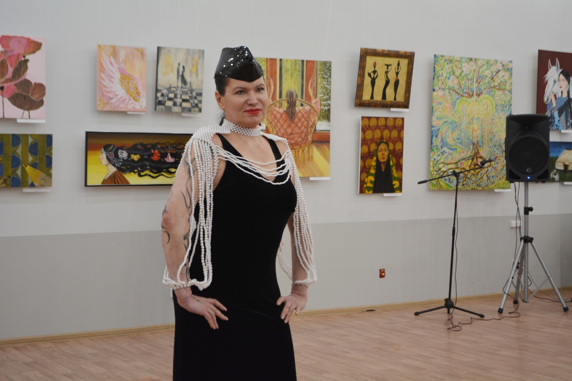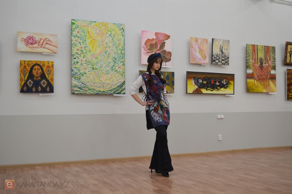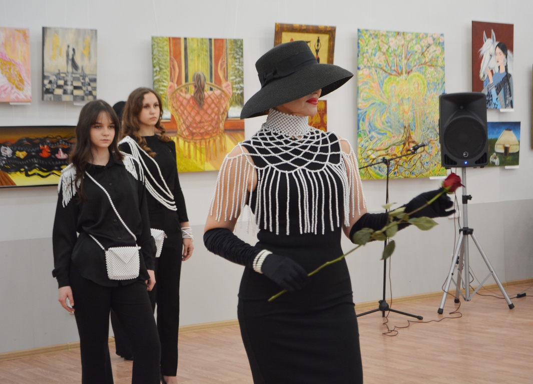 В день открытия выставки «Женские истории» публике не только представили работы авторов, но и провели показ модных коллекций, организованный арт-директором общественного объединения «Шебер» Татьяной Грибановой.