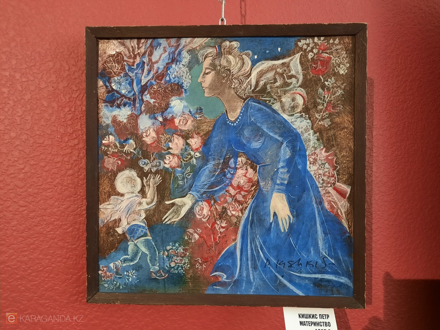 Работа «Материнство», добавила Бибигуль Исполова, трогает: в ней есть и нежность, и лёгкость, и трепетность, и возвышенность. Работает и символика цвета, продолжила Татьяна Абилова: оттенки картины роднят её с религиозными сюжетами: мать одета в синее платье, а в иконописи синий цвет считается божественным. Правда, этот момент – специально ли так задумано – автор никак не прокомментировал, а просто загадочно улыбнулся.