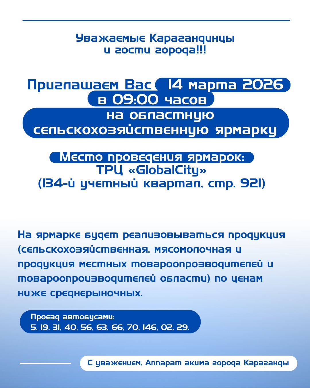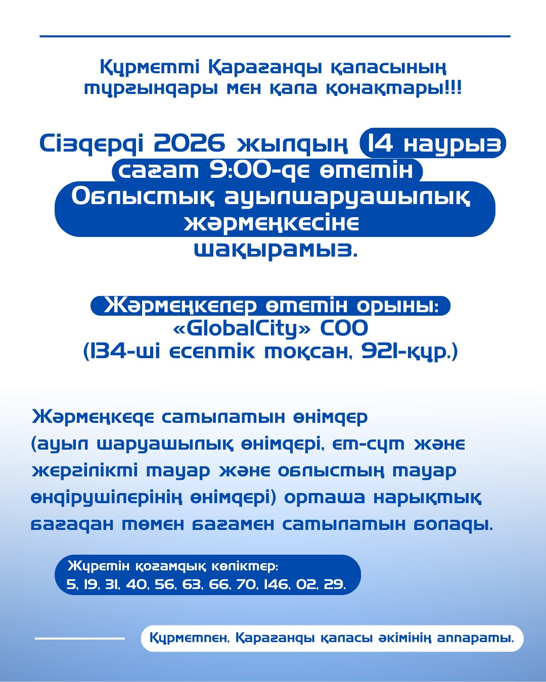 Фото: GPTchat Акимат города приглашает жителей и гостей на областную сельскохозяйственную ярмарку, которая состоится 14 марта в 09:00. Место проведения традиционное: ТРЦ Global City, по адресу: 134-учетный квартал, стр. 921, передает корреспондент ekaraganda.kz.