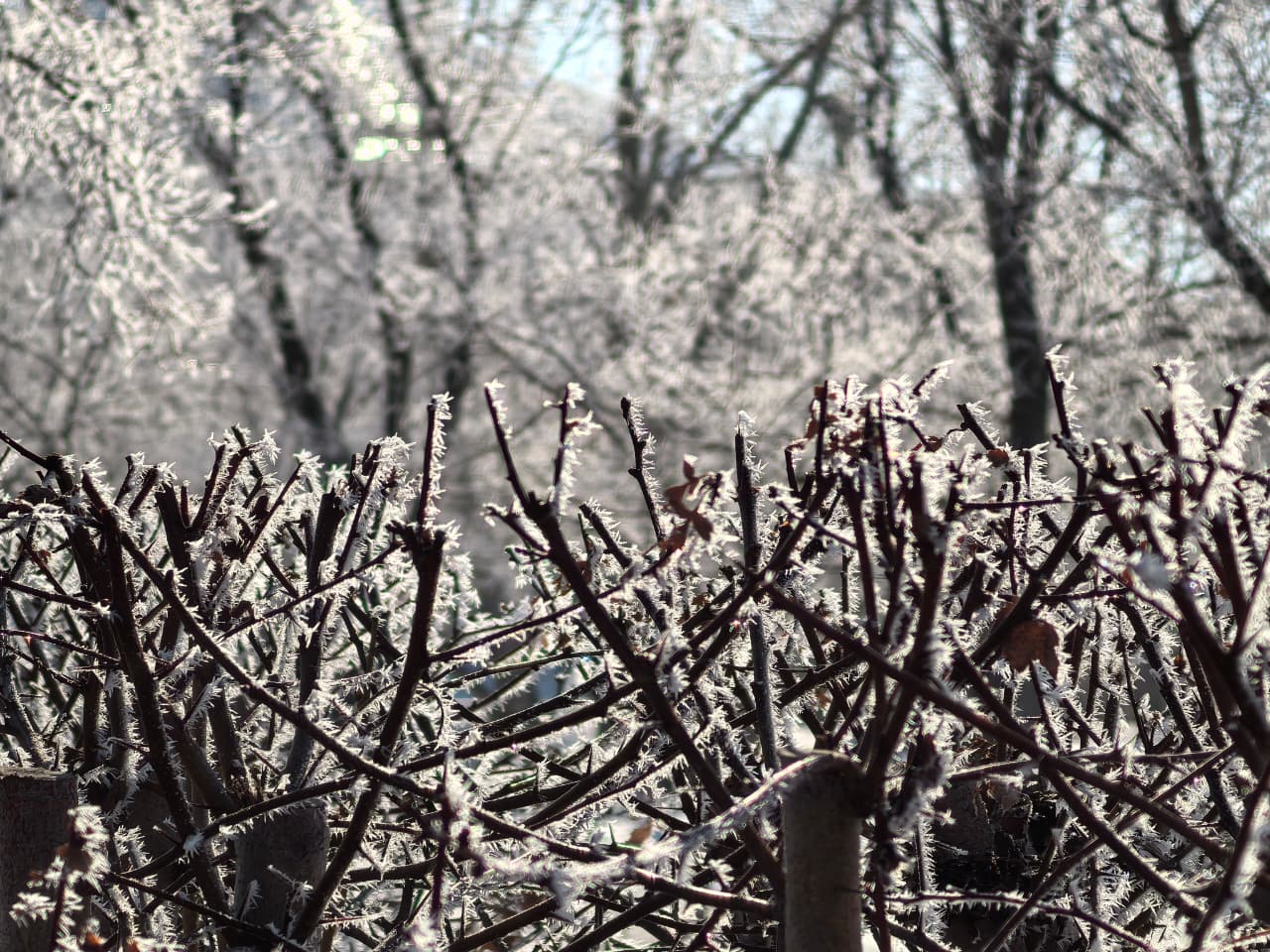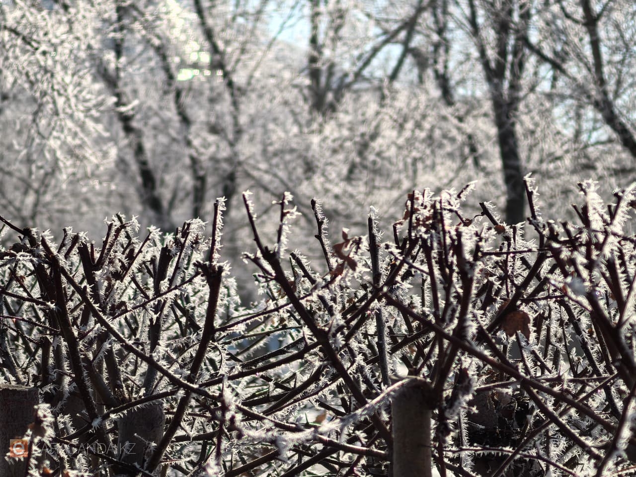 Солнечные лучи пробиваются сквозь кроны и заставляют этот иней мерцать, будто парк ненадолго превратился в декорацию из сказки.