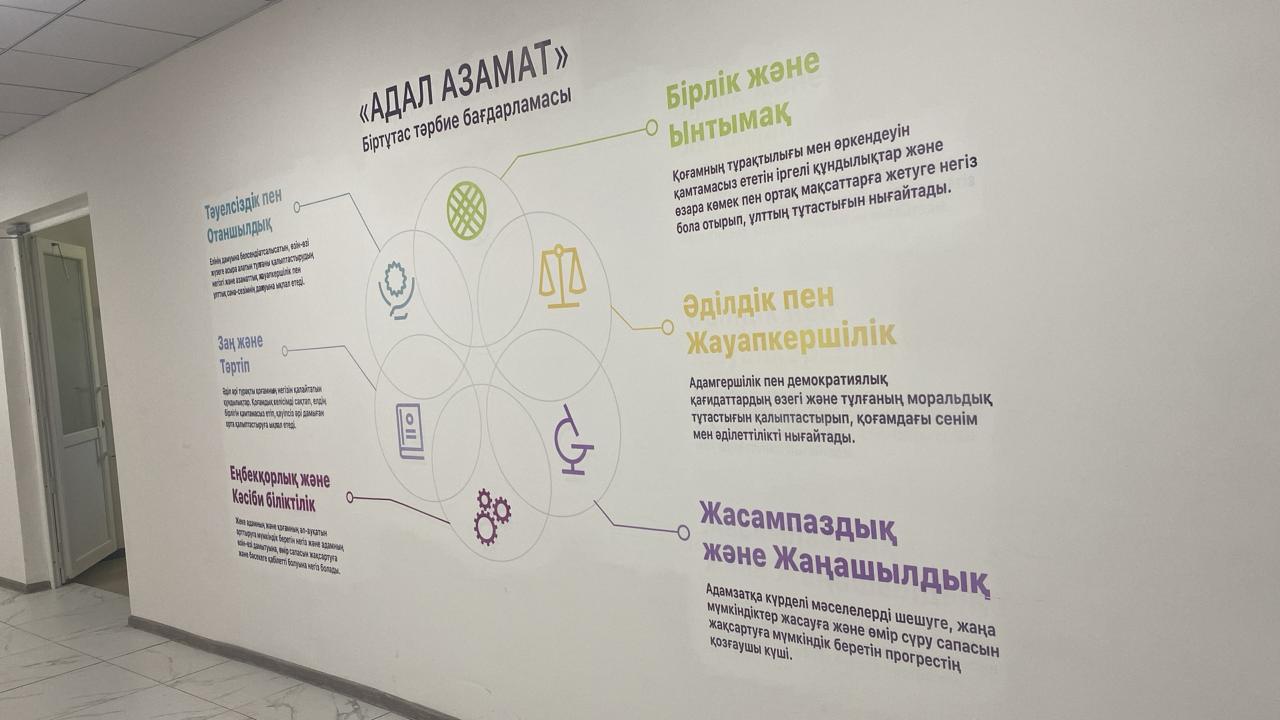 Единый дизайн-код школ, разработанный в рамках программы «Адал Азамат», призван не только визуально обновить школы, но и сформировать ценностную среду для учеников. Детали кода отражены в брендбуке – там же обозначены визуальные творческие решения, цветовая палитра, макеты и детали оформления школьного пространства. Сейчас интерьеры школ в регионах страны поэтапно обновляют в соответствии с требованиями брендбука, а учебные кабинеты оформляются с учетом возрастных особенностей школьников.
