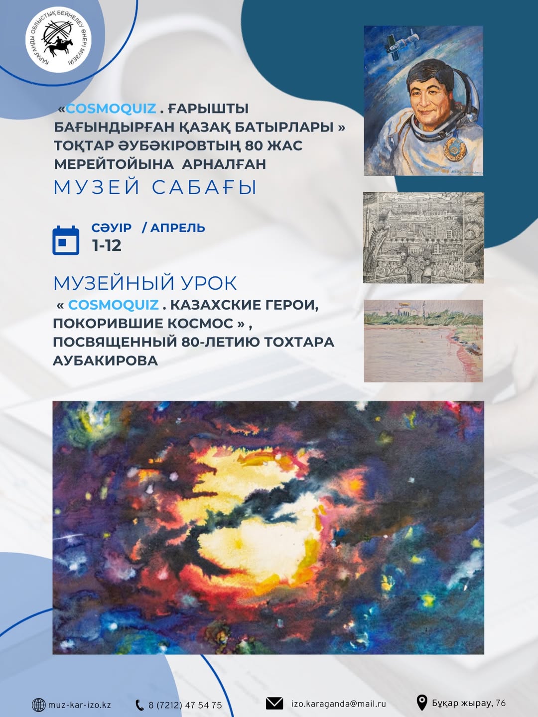 Музейные уроки под названием «Cosmoquiz. Казахские герои, покорившие космос» продлятся в музее Изобразительного искусства до 12 апреля. Вход на них по билетам, занятия проводятся со вторника по пятницу с 10.00 до 18.00, в группах не менее 10 человек. Возраст желающих – любой, длительность встречи – до 40 минут.