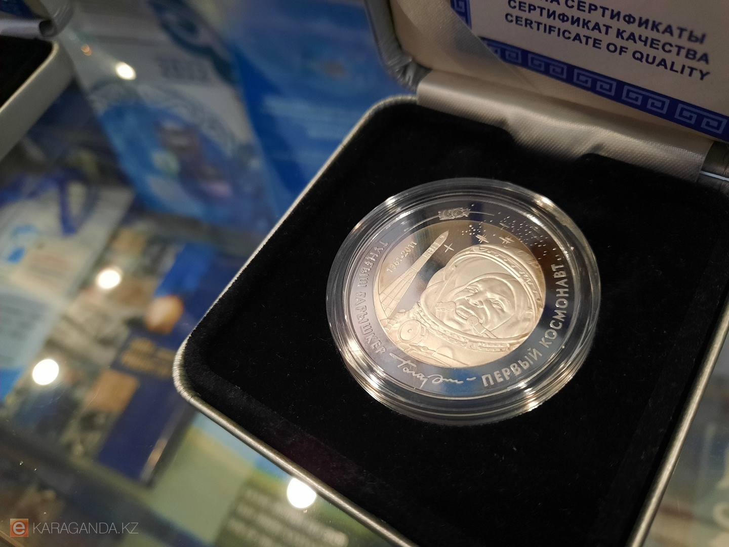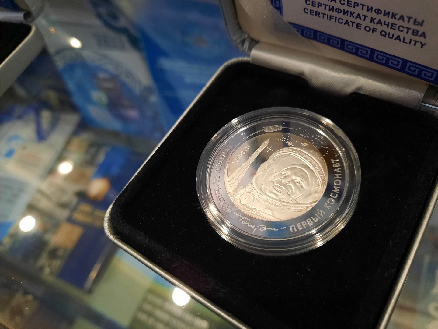 В ходе нашей небольшой экскурсии мы подходим к витрине с коллекционными монетами из танталового серебра, на одной из которых изображён портрет Юрия Гагарина.