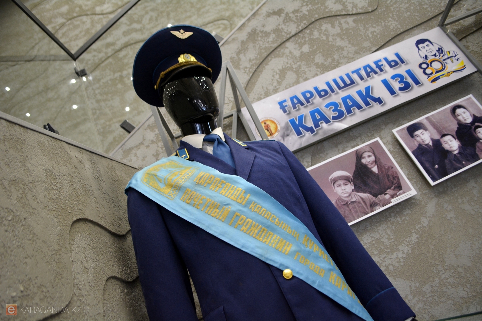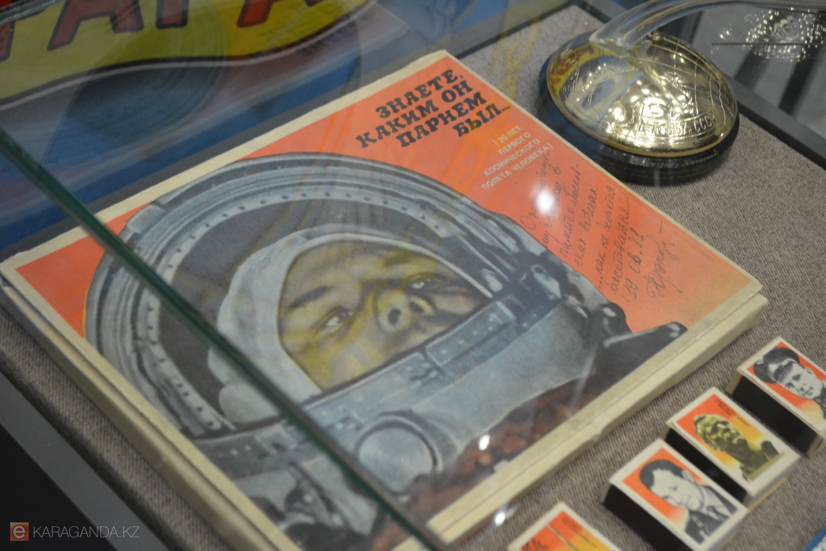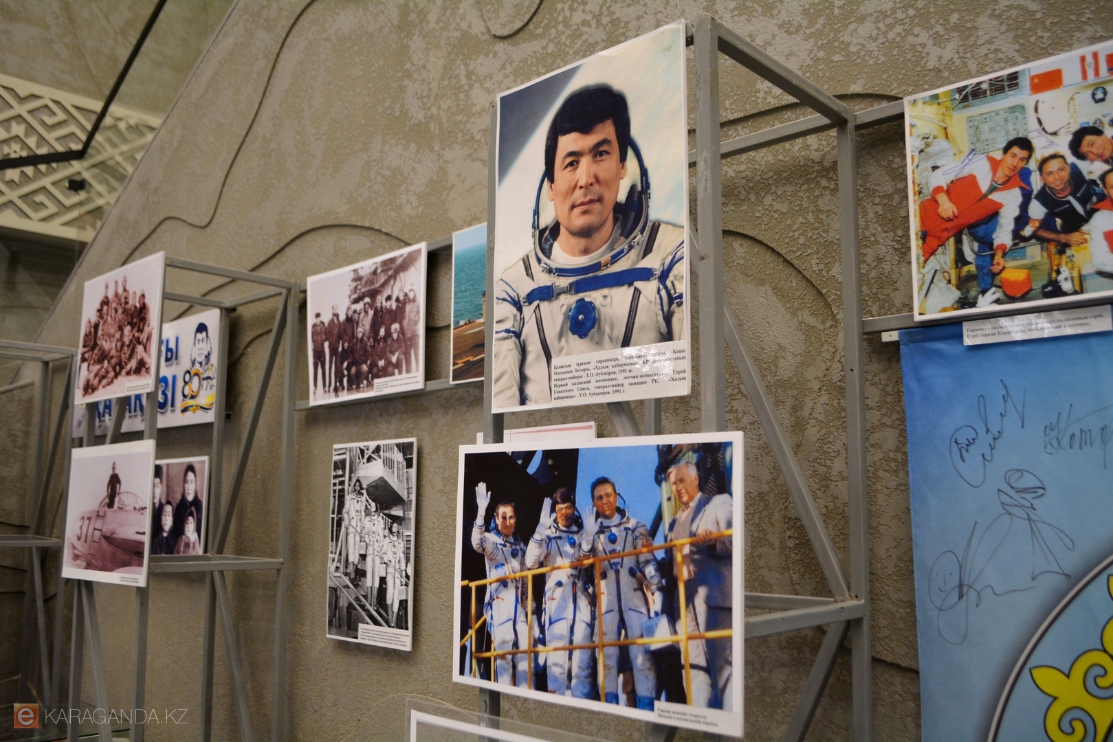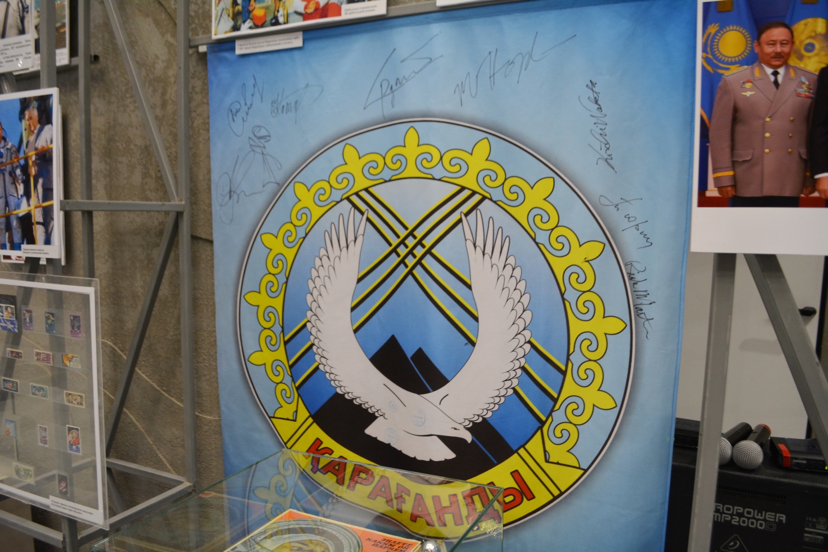 Есть на выставке экспонат, полученный относительно недавно – 12 лет назад: это герб Караганды, побывавший в космосе, с подписями космонавтов.