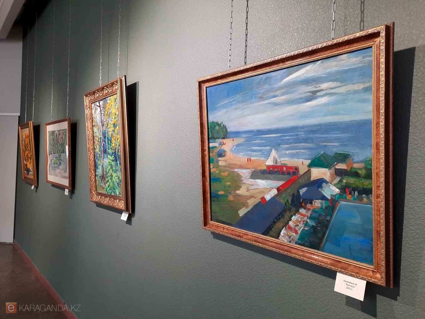«Это здорово, потому что раньше пейзажи чаще писали с натуры. Сейчас, допустим, выйти на пленэр в город уже не так просто. Зачастую художники располагаются в кафе: на улице их могут отвлекать. В Караганде, кроме того, всё ещё немало серых домов, несмотря на яркие детали – украшения или обновлённые крыши. Здесь же, в работе Reiviero Мурата Калкабаева 2011 году, цвет играет особенно ярко – крыши, беседки, море, небо, песок на пляже...» – делится Елена Кондратьева.