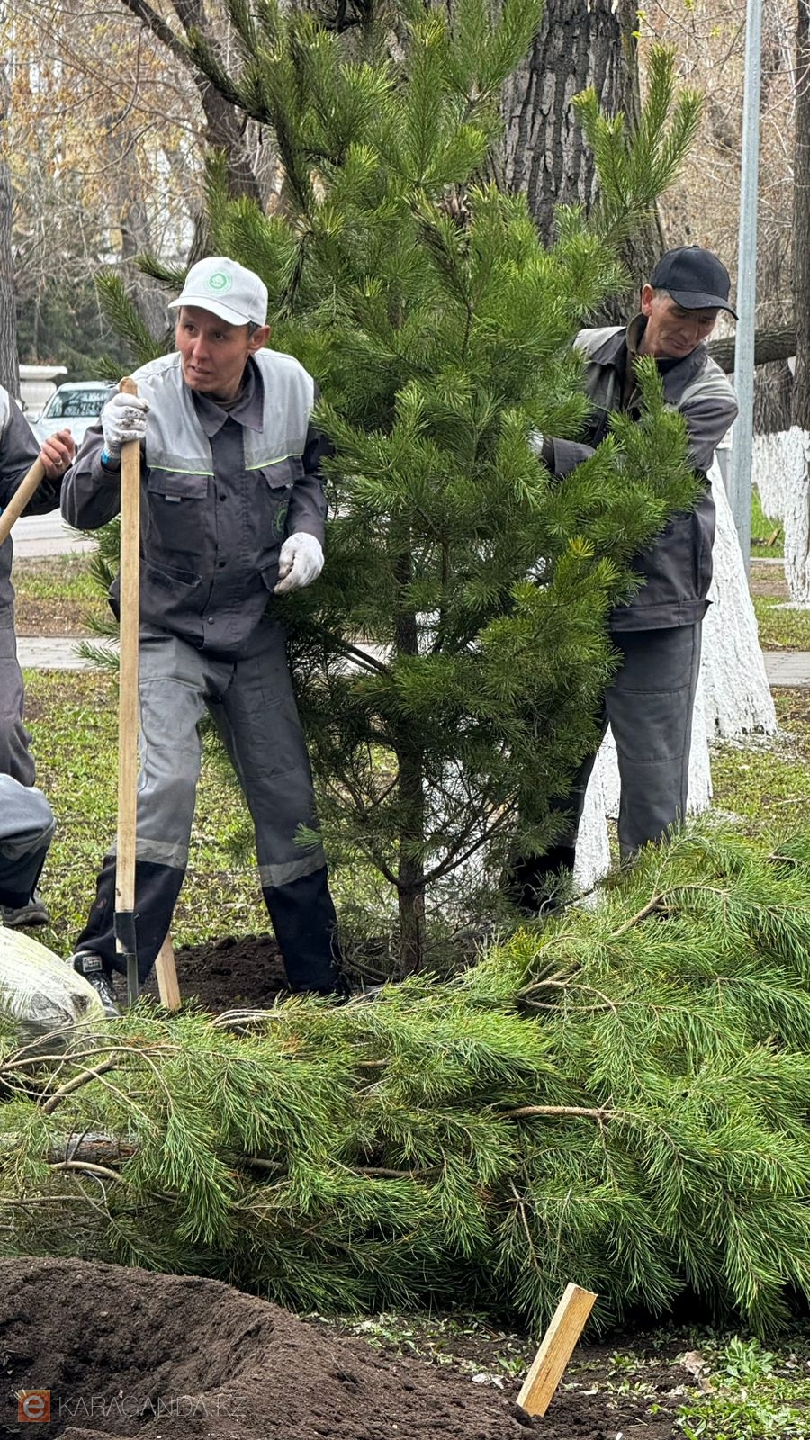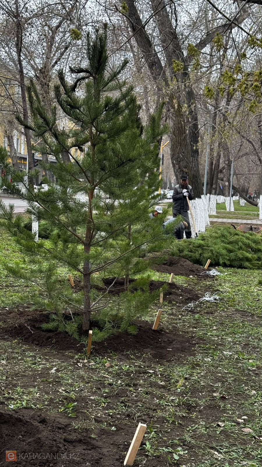 Работы по озеленению ведутся не только в центральной части города. Новые деревья высаживаются также вдоль дороги к аэропорту и в других районах Караганды.