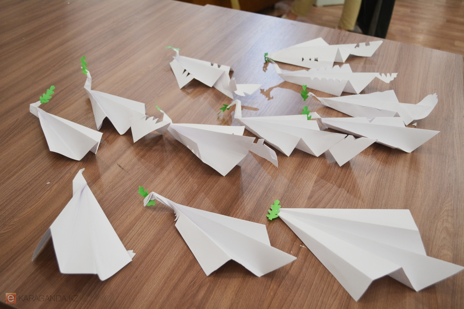 Ещё до начала встречи карагандинская художница Мария Скорикова провела с желающими гостями мастер-класс: собравшись вокруг стола, каждый создавал голубя мира в технике оригами.