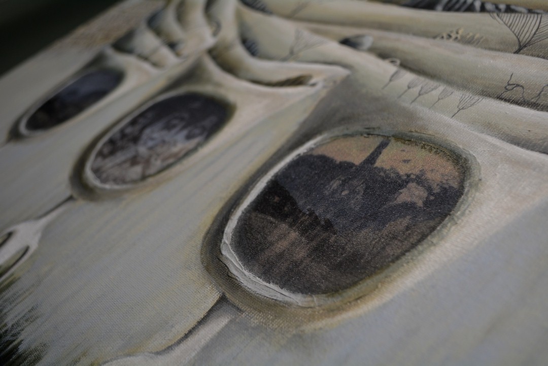 Недалеко от работ Бибигуль – триптих Татьяны Абиловой «Имплант памяти», выполненный в технике коллажа. Отправной точкой стала семейная реликвия – бабушкина брошь.