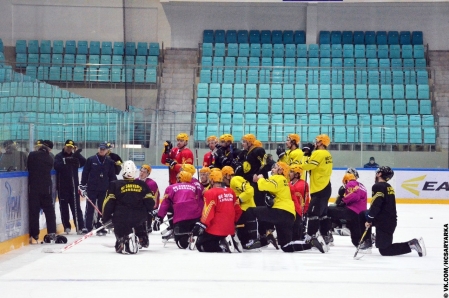 Мы имели возможность понаблюдать за подготовкой команды более полутора часов. Главный тренер Душан Грегор со своими помощниками Михаилом Пикаловым и Борисом Тортуновым давали задачи для команды, которые выполнялись со всей самоотдачей каждым из игроков. Не всё получалось с первого раза, видно было, что не всем доволен наставник черно—желтых, но после объяснения ошибок упражнение повторялось и всё складывалось более удачно. Тренировка завершилась импровизированным матчем, где наши играли против наших. И всё было как по настоящему, два вратаря, две команды, пусть даже на самом деле играющих в одной, и радость заброшенным шайбам в ворота «соперникам».