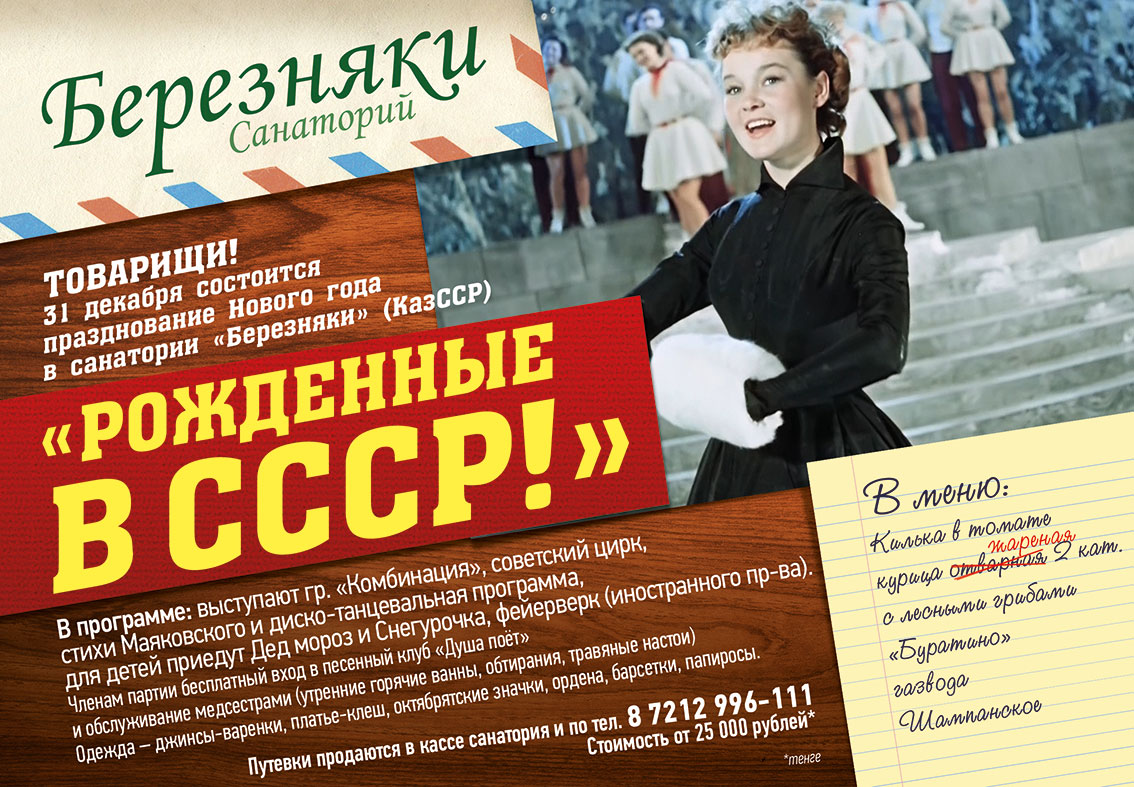 Думаете где встретить Новый год? Конечно в «Березняках»! Только для пользователей сайта www.ekaraganda.kz огромные скидки на новогоднюю программу «Рожденные в СССР» (с 31.12.13г. по 02.01.14г.), с арт-агентством «Позитив». Стоимость новогоднего путешествия от 25.000 тенге.