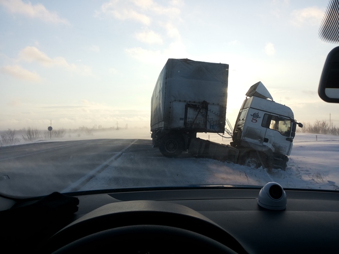 16 января водитель автомашины марки КамАЗ, житель Южно-Казахстанской области на автодороге Алматы-Екатеринбург в условиях плохой видимости из-за погодных условий не справился с управлением и вылетел в кювет. Прицеп грузовой автомашины остался на дороге и создавал помехи для движения другого транспорта. Прибывшими на место полицейскими батальона дорожно-патрульной полиции при помощи другого транспорта КамАЗ был вытащен из кювета и отбуксирован до ближайшей стоянки.
