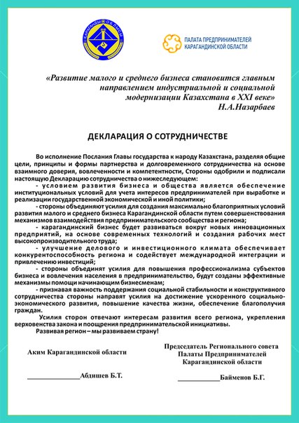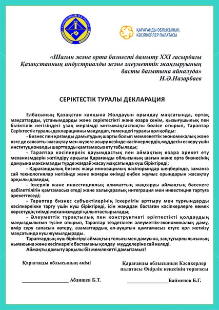 В завершение была подписана декларация о сотрудничестве между акиматом области и Палатой предпринимателей по созданию благоприятных условий для развития малого и среднего бизнеса.