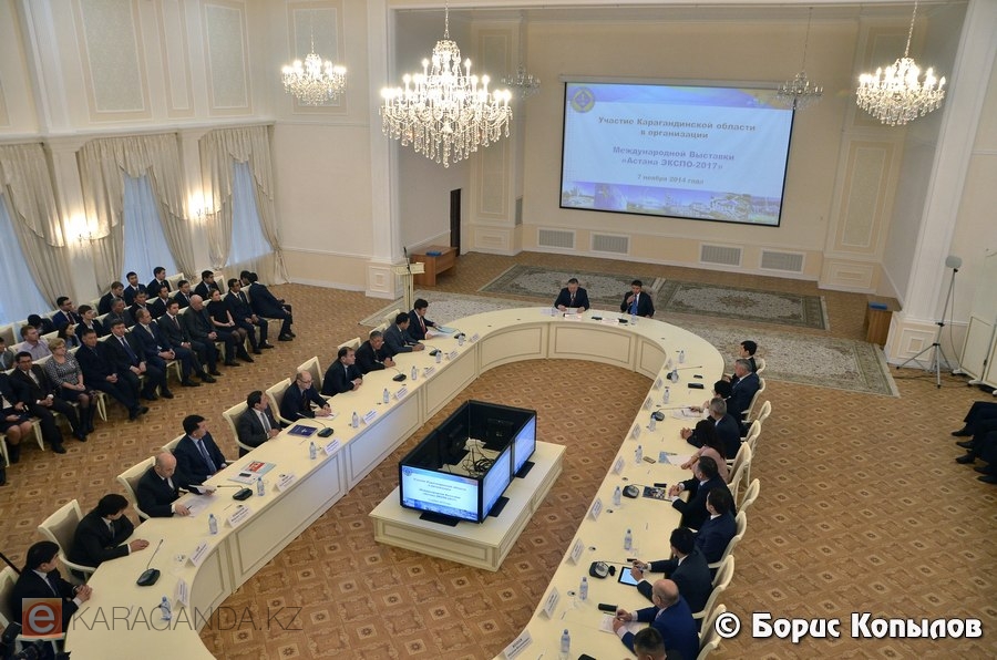 После посещения выставки делегация приняла участие в совещании, которое провел аким Карагандинской области Нурмухамбет Абдибеков. О целях и задачах Международной выставки и перспективах, открывающихся для отечественных товаропроизводителей, рассказал главный менеджер Департамента архитектуры Национальной компании «Астана ЭКСПО-2017» Айдар Марат.