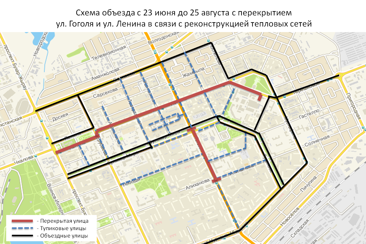С 23 июня до 25 августа планируется перекрытие улицы ул. Гоголя от Бульвара Мира до ул. Алиханова и ул. Ленина, в связи с проводимой реконструкцией тепловых сетей.
