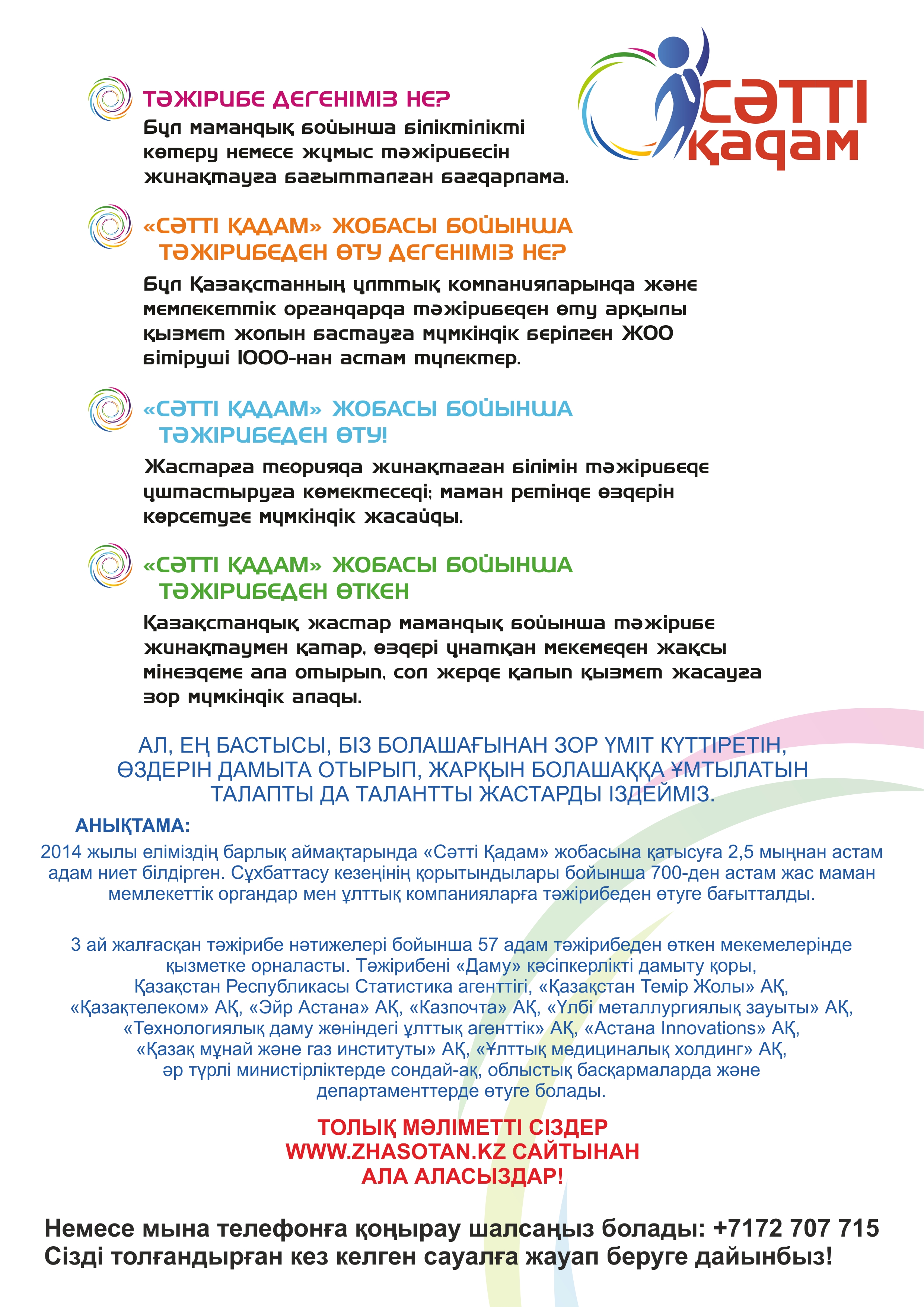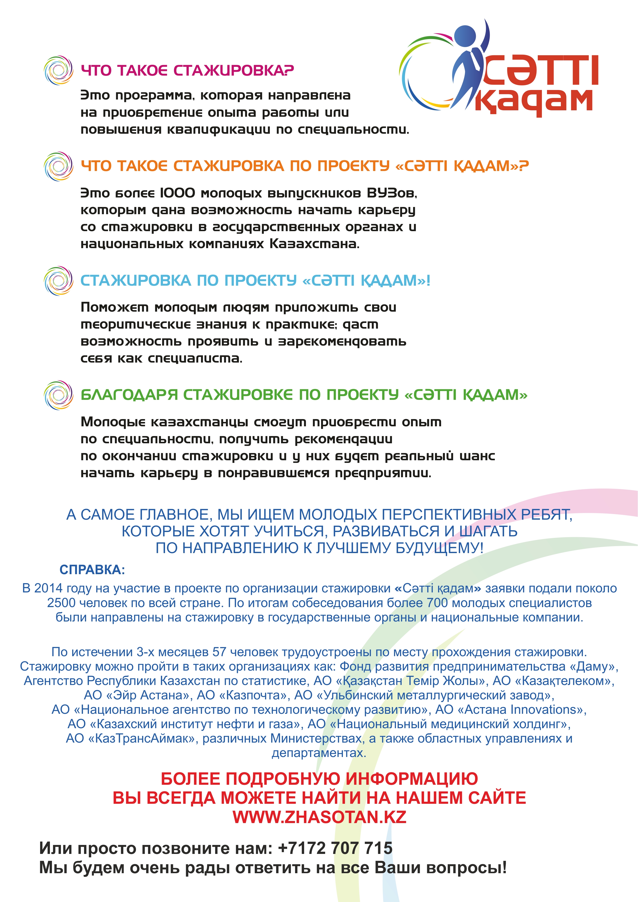 В Караганде полным ходом идет прием документов для организации стажировок в рамках проекта «Сәтті қадам» – «Путевка в жизнь», реализуемого молодежным крылом «Жас Отан».