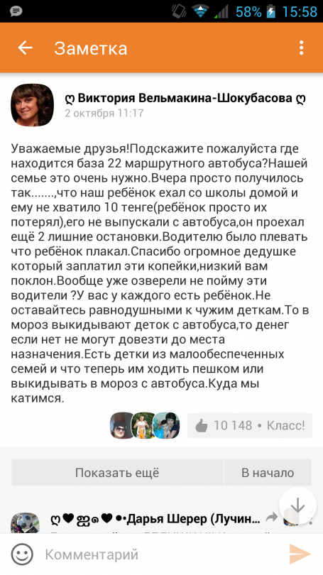 "Уважаемые друзья! Подскажите, пожалуйста, где находится база 22 маршрутного автобуса? Нашей семье это очень нужно. Вчера просто так получилось, что наш ребёнок ехал со школы домой и ему не хватило 10 тенге. Ребёнок просто их потерял, а его не выпускали из автобуса, он проехал ещё две лишние остановки", - написала в социальных сетях мама школьника Виктория Вельмакина.
