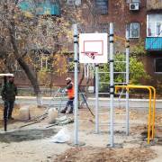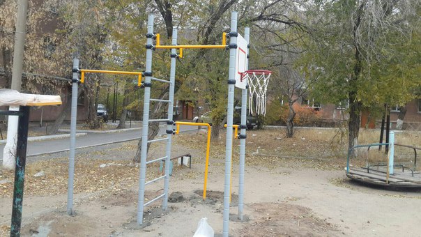 На сегодняшний день во дворе установлены горка, две качели, спортивный комплекс турников и баскетбольный щит.