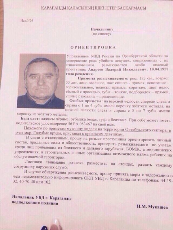 Российские полицейские разыскивают в Караганде уроженца Орска Валерия Андреева, обвиняемого в жестоких убийствах, сообщает корреспондент Tengrinews.kz. В СМИ России его прозвали "орским маньяком". Мужчину подозревают в убийстве как минимум семи девушек, сопряженных с их изнасилованием.