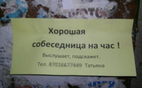 "Идею я увидела в телепередаче - россиянка расклеивала объявления, предлагая свои услуги собеседницы, подсказать людям как поступить в трудной ситуации. Хоть я и не психолог, я решила поступить также - ведь я умею слушать, у меня есть жизненный опыт, могу дать хороший совет. Я долго думала над текстом объявления. Напишешь "Друг/Подруга на час" - неправильно истолкуют. Поэтому остановилась на таком варианте. Несколько недель назад я расклеила около 100 объявлений, но пока встреч не было. Поступило примерно 15 звонков, люди интересуются что и как. Я вижу, что сегодня именно молодым людям не к кому обратиться за советом в трудной ситуации. Один парень назначил встречу, но не пришел. Потом сказал, что забыл. Я не сержусь", - говорит "народный психотерапевт".