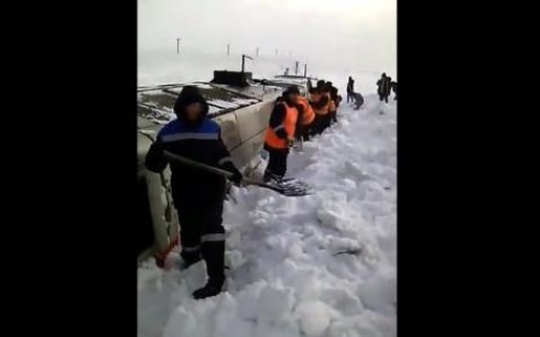 На железной дороге Алматы - Караганда тепловоз засыпало снегом почти по самую крышу. Очевидец запечатлел момент, когда рабочие прибыли освобождать поезд из снежного плена. Ролик опубликовал пользователь Серик Куатов на сайте YouTube.
