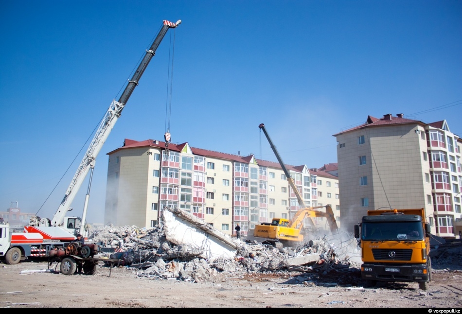 1. На месте четырехподъездного блока дома №7, обрушившегося 5 апреля, сейчас ведутся работы по разбору руин. В 65 квартирах рухнувшей части дома проживало 165 человек. Только из 28 квартир жители успели вывезти мебель до того, как всех эвакуировали. Сейчас пострадавшие жильцы живут либо в предоставленном акиматом общежитии, либо на съемных квартирах, либо у родственников и друзей. Разбор обломков планируют завершить в течение ближайшей недели