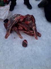 При досмотре прицепа обнаружены мешки с тремя тушами сайгака. На место происшествия незамедлительно была вызвана следственно-оперативная группа ОВД Нуринского района, которой были изъяты ружье, патроны, туши сайгаков в мешках и снегоход.