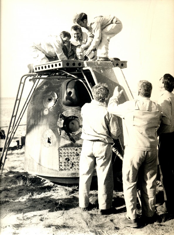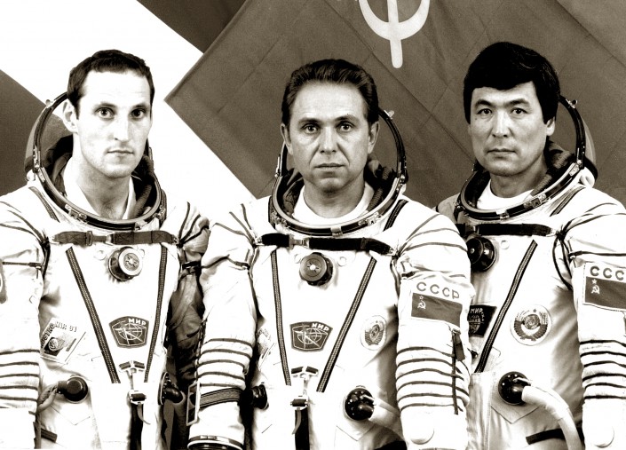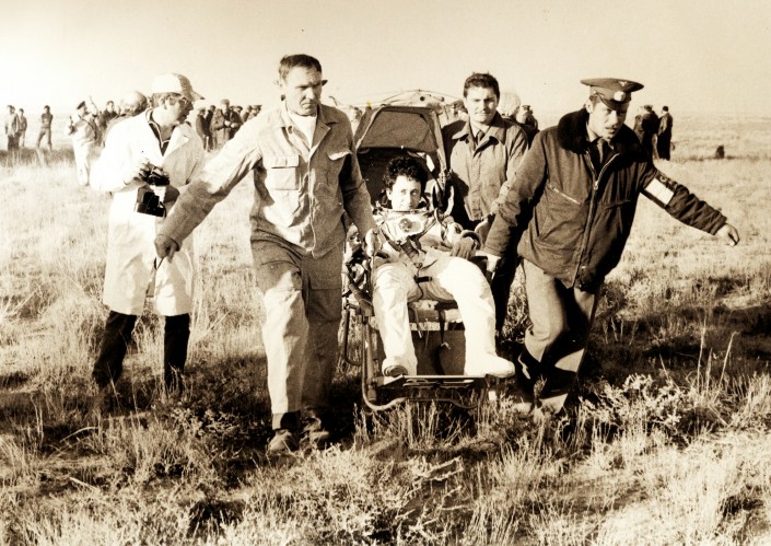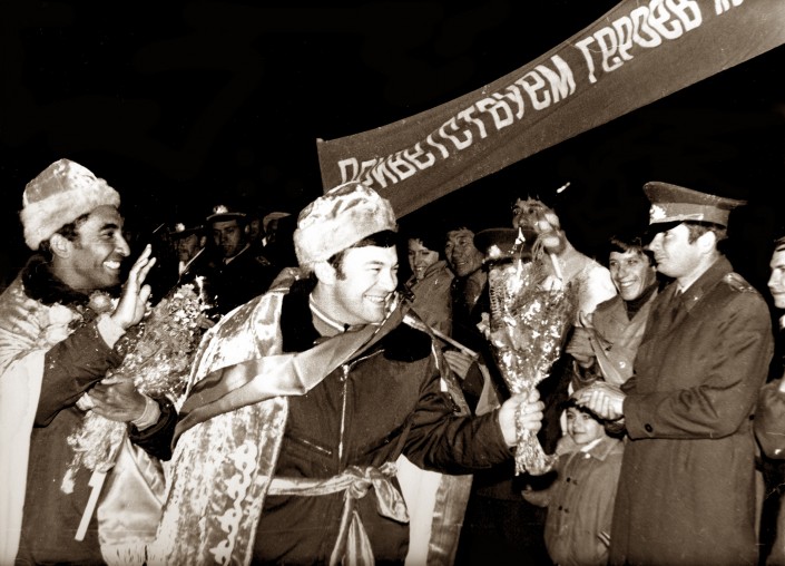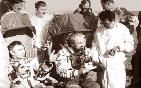 Следом за американским астронавтом Актау в 1981 году посетили и советские летчики-космонавты Алексей Леонов и Владимир Джанибеков. Леонов прославился тем, что первым в мире в марте 1965 года совершил выход в открытый космос, во время которого проявил большое мужество, особенно во время нештатной ситуации, когда разбухший космический скафандр препятствовал возвращению космонавта на корабль. Алексей Леонов находился в открытом космосе 12 минут 9 секунд. При возвращении космического корабля на Землю отказала система ориентации, и космонавты, вручную сориентировав корабль, совершили посадку в запасном районе.