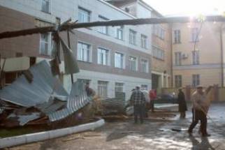Часть из них упала на крышу крыльца, часть – на асфальт, заблокировав вход в больницу. Сейчас работники клиники разбирают получившийся завал. Они оттаскивают доски и листы железа в сторону от крыльца.