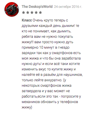 Один из ранее установивших программу юзеров отметил, что если залить специальную жидкость в 3,5-миллиметровый разъем для наушников, то смартфон якобы превращается в электронную сигарету. Его шуточный отзыв поддержали и другие пользователи, поблагодарившие создателей приложения за возможность "парить" через свои гаджеты.