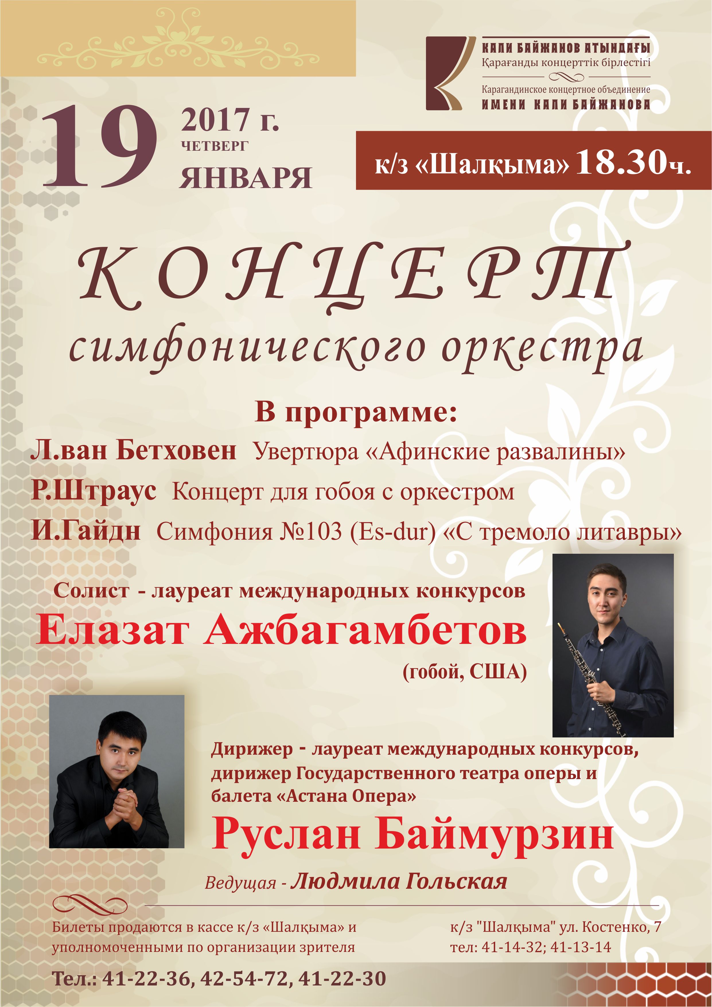 В концертном зале "Шалкыма" 19 января в 18:30 выступит лауреат международных конкурсов Елазат Ажбагамбетов. Солист сыграет на гобое.