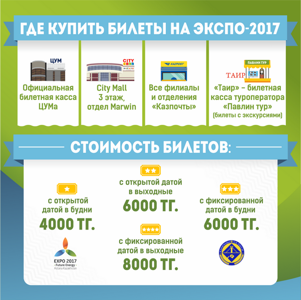 Билеты на ЭКСПО в Караганде можно купить во всех отделениях «Казпочты» и в кассах, расположенных в торговых домах «Таир», ЦУМ и City Mall. А также на сайте tickets.expo2017astana.com.