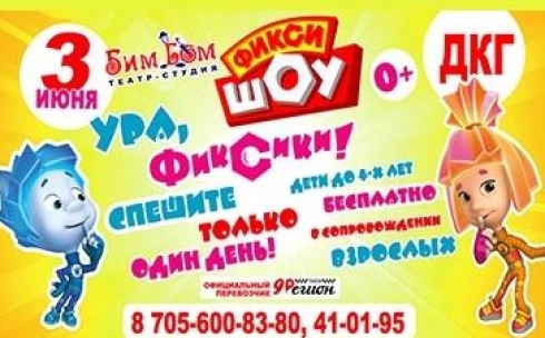 3 июня маленьких карагандинцев ожидает долгожданная встреча с любыми персонажами известного мультипликационного сериала. Организаторы из Москвы поставят на местных подмостках музыкальный спектакль "Фикси-шоу".