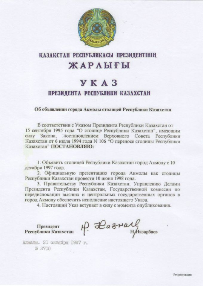 Указ Президента Республики Казахстан был опубликован 20 октября 1997 года. В нем говорилось об объявлении города Акмолы столицей Республики Казахстан с 10 декабря 1997 года, а также назначалось проведение официальной презентации города Акмолы в качестве столицы Республики Казахстан на 10 июня 1998 года.