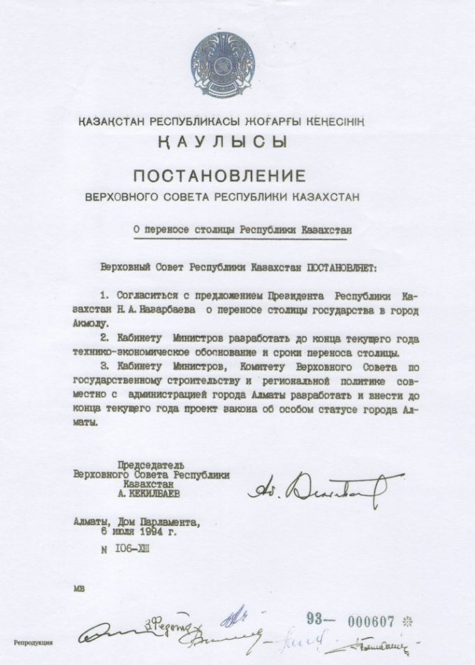 Постановление подписали председатель Верховного Совета Абиш Кекильбаев и ряд должностных лиц. В нем говорилось о согласии с предложением Президента Республики Казахстан Н.Назарбаева о переносе столицы государства в города Акмолу.