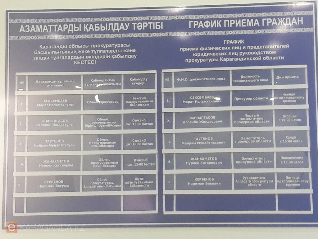 Помимо рядовых прокуроров, обращения принимают и руководители областной прокуратуры на основании соответствующего графика. Предварительно можно записаться по телефону 8(7212)42-40-19.