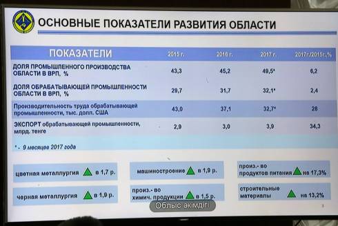 - Темп производства обрабатывающего сектора в 2017 году к 2015 году увеличен в 1,7 раза. Рост связан с увеличением производства в приоритетных секторах ГПИИР: цветной и чёрной металлургии, машиностроении, производстве химической промышленности, продуктов питания, строительных материалов. Объём обрабатывающего производства за 2017 год составил 1,8 трлн тенге, - доложил и. о. руководителя Управления промышленности и индустриально-инновационного развития Кайрат Шорманбаев.