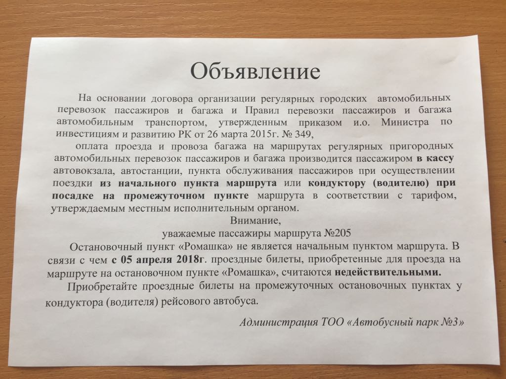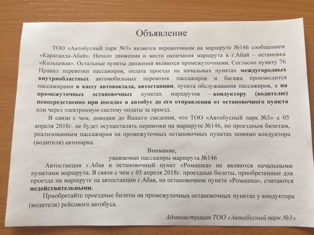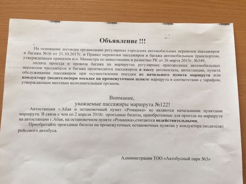 - Чтобы решить проблему, в соответствие с Правилами перевозки пассажиров, по маршруту №122, согласно пункту 45, в промежуточных пунктах реализация проездных билетов не должны осуществлять киоски, а продажу осуществляет водитель или кондуктор, - делится Артур Григорян, директор ТОО «Автобусный парк №3». - Для междугородних – это 76 пункт. Для того, чтобы оптимизировать наши затраты мы приводим в соответствие с Правилами все промежуточные пункты. Теперь пассажиров города Абая будут обилечивать кондукторы или водители маршрутных автобусов.