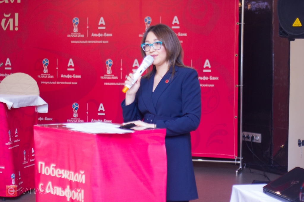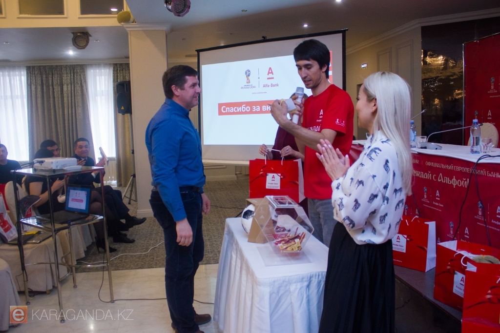 Одним из ярких событий этого лета является Чемпионат мира по футболу в России, который пройдет с 14 июня по 15 июля. Альфа-Банк Казахстан выступает официальным региональным партнером FIFA 2018. В рамках этого грандиозного события, 19 апреля в отеле «Космонавт» состоялась встреча руководства банка с потенциальными клиентами - представителями малого и среднего бизнеса Караганды. А в завершении мероприятия был проведен розыгрыш официальных сувениров Чемпионата мира по футболу.