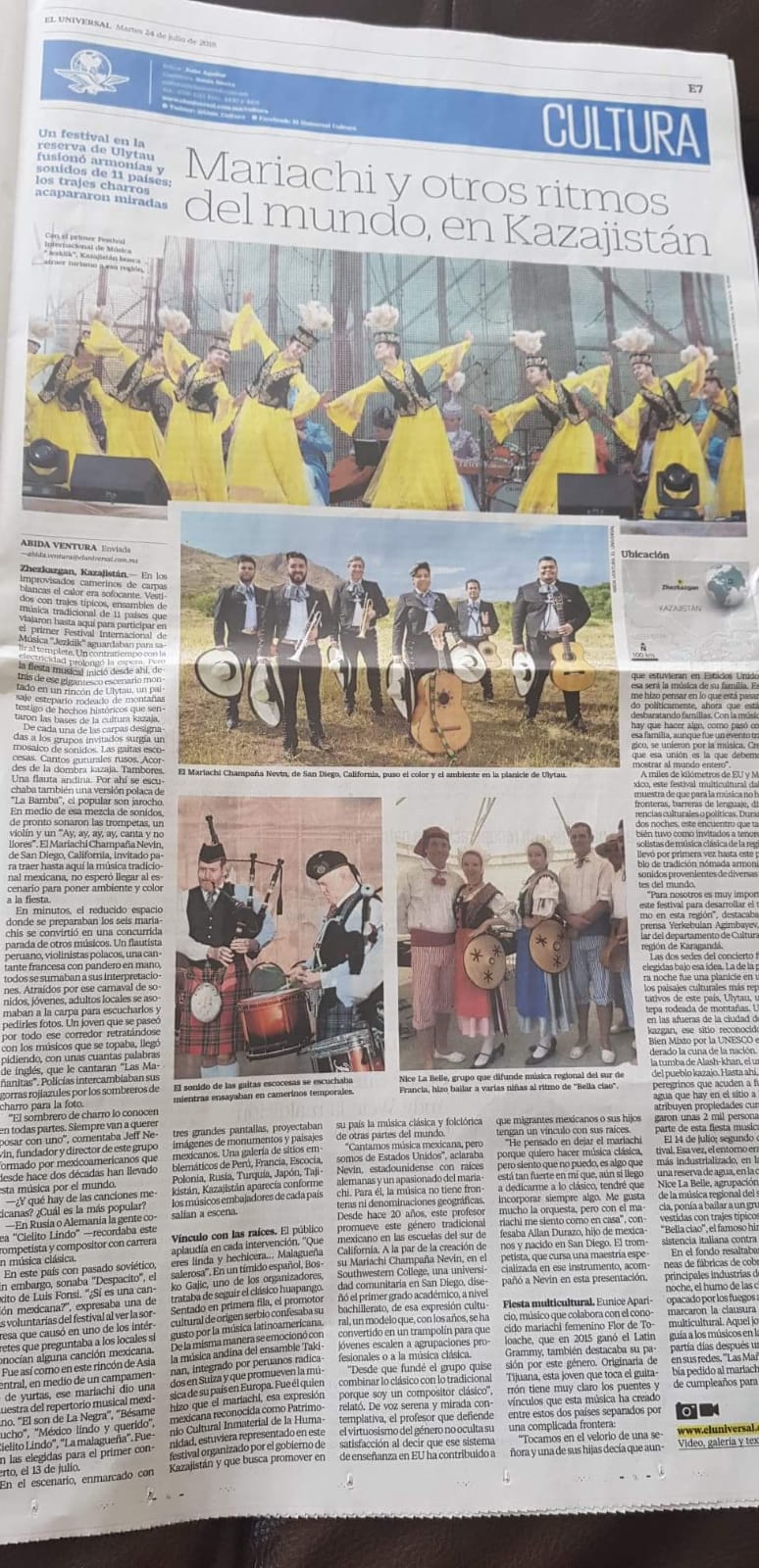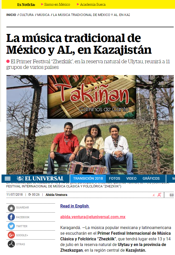 Крупнейшие мексиканские газеты«ElUniversal» и «La vozdeMichoacan», международный журнал об оперном искусстве «NewMerker», выпускающийся в Австрии, интернет-портал «Peruanosensuiza» и другие издания из разных стран рассказали своим читателям о фестивале этнической музыки «Жезкиiк», прошедшем в июле в Улытау Карагандинской области.