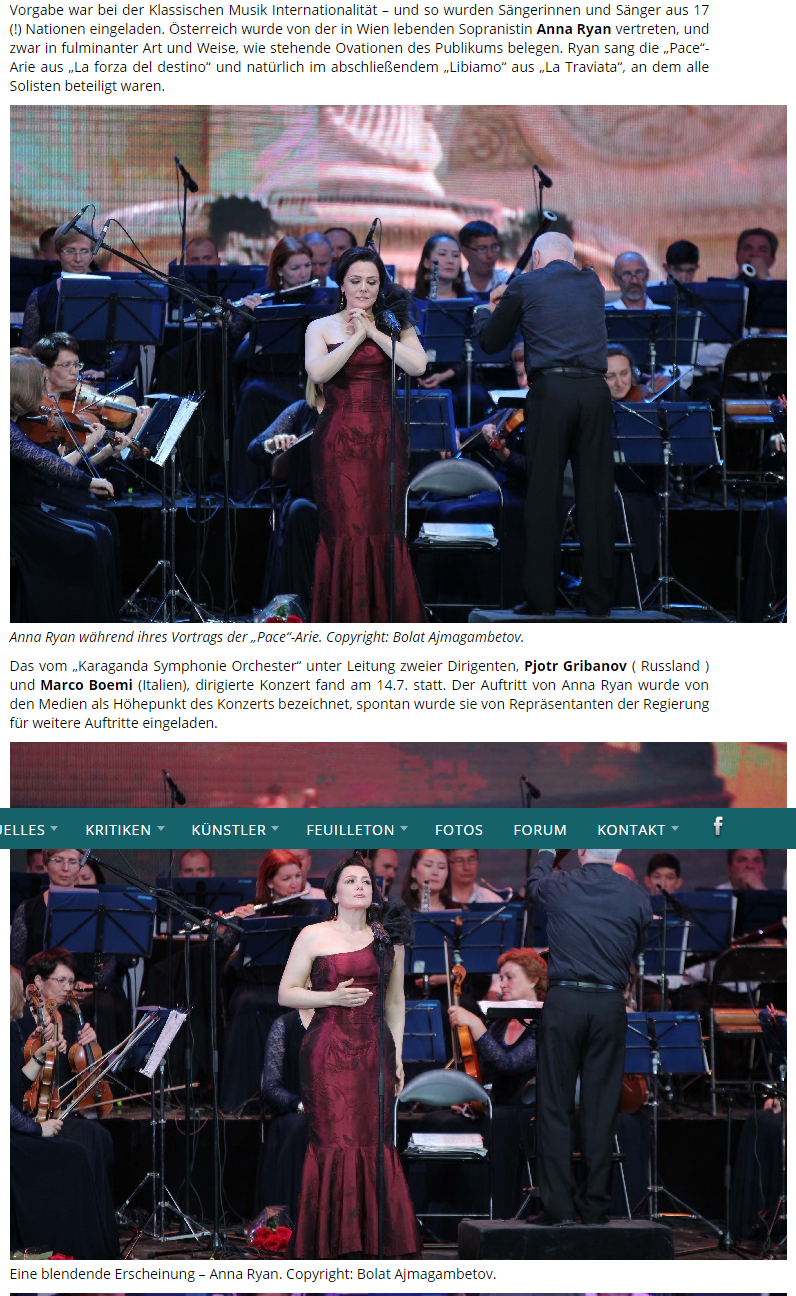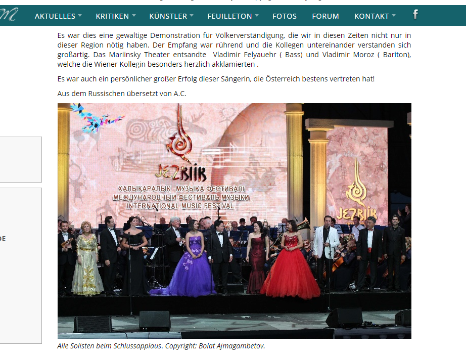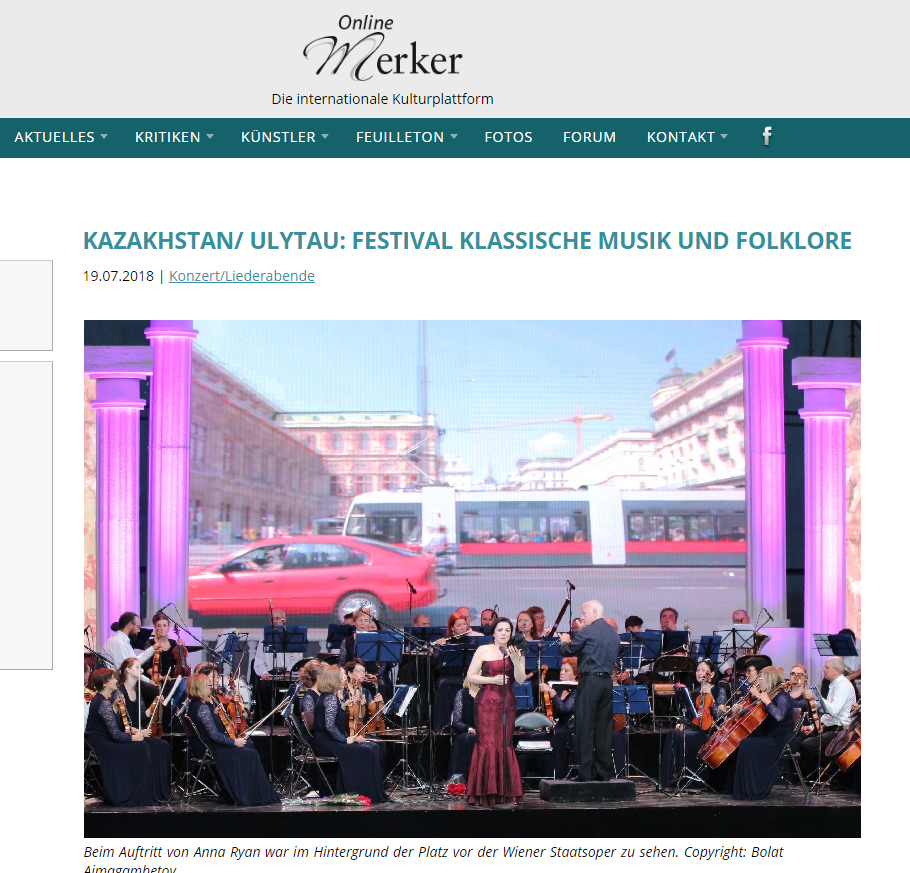 В то же время в Австрии авторитетный специализированный журнал «NewMerker» и международный культурный интернет-портал «Online-Merker» также опубликовали репортаж о фестивале в Улытау. В центре внимания корреспондентов изданий было выступление австрийской оперной певицы Анны Риан.
