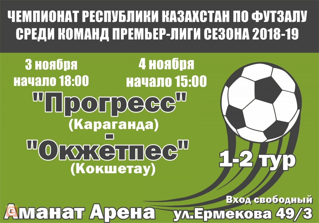 3 и 4 ноября в СК «Аманат-Арена» (Ермекова 49/3) пройдут игры первого и второго тура чемпионата Казахстана по футзалу среди команд премьер лиги 2018-2019 года. Вход свободный.