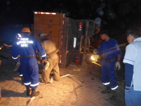 В воскресенье вечером на 1309 километре автотрассы Алматы-Екатеринбург, произошло крупное дорожно-транспортное происшествие. Житель Астаны, управляя грузовиком Shaanxi, груженным щебнем, двигаясь в направлении Астаны, выехал на полосу встречного движения и допустил столкновение с рейсовым автобусом Yutong, следовавшим по маршруту Астана-Караганда. При этом не удалось избежать столкновения и легковой автомашине Audi-100, в которой находились четыре человека