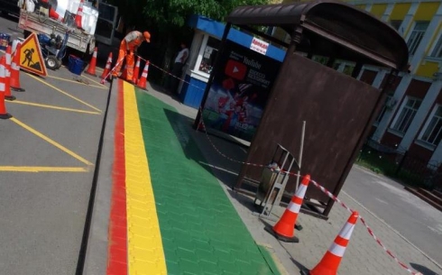Красочная дорожная разметка появилась на одном из остановочных павильонов Караганды. Ближе к проезжей части на дорожное покрытие нанесли красную полосу, за которую не следует выходить ожидающим маршрутные транспортные средства. Далее следует жёлтая полоса – предупреждающая, и зелёная зона, где пассажиры могут дождаться автобуса.