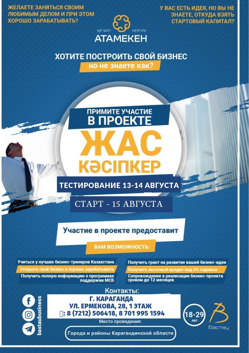 С 14 августа стартует 2-й поток проекта национальной палаты предпринимателей «Атамекен» «Жас кәсіпкер». Участие в проекте даст возможность молодежи обучиться основам предпринимательства, найти свою нишу, открыть свой бизнес и получить стартовый капитал в виде гранта 200 МРП (505 тыс. тенге), льготный кредит под 6% годовых на сумму до 8000 МРП.