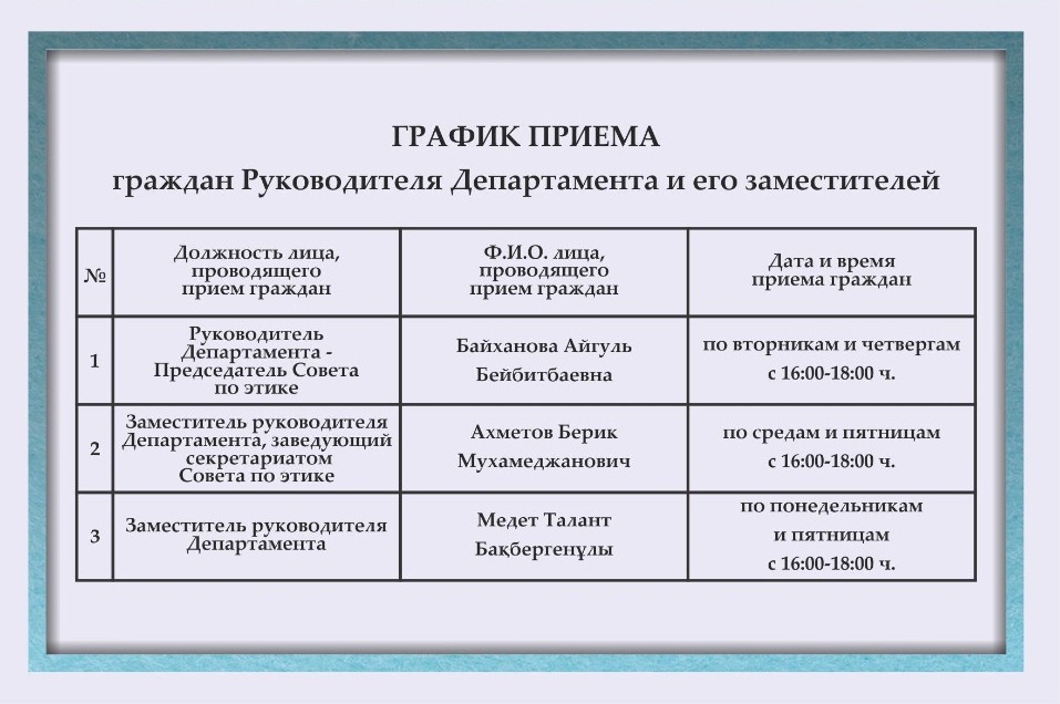 Прием граждан осуществляется в соответствии с графиком в здании департамента, расположенный по адресу проспект Назарбаева 39 (2 этаж) или же в онлайн режиме посредством приложения «Facebook Messenger».