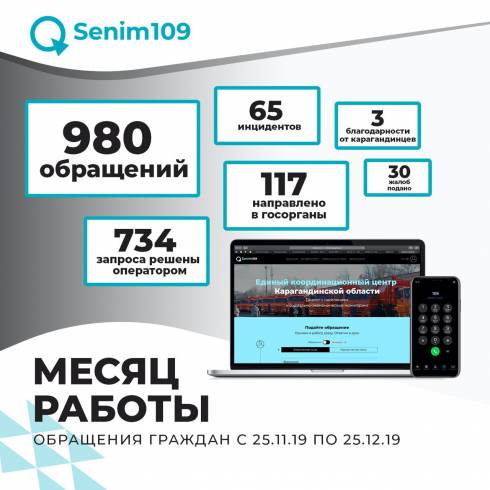 Для решения поступивших обращений, к системе службы Senim109 подключены более 60 государственных и коммунальных учреждений города Караганды.
