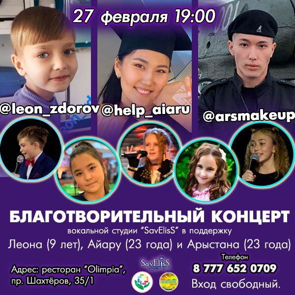 27 февраля в Караганде состоится благотворительный концерт, организованный для сбора средств на лечение сразу троих жителей города.