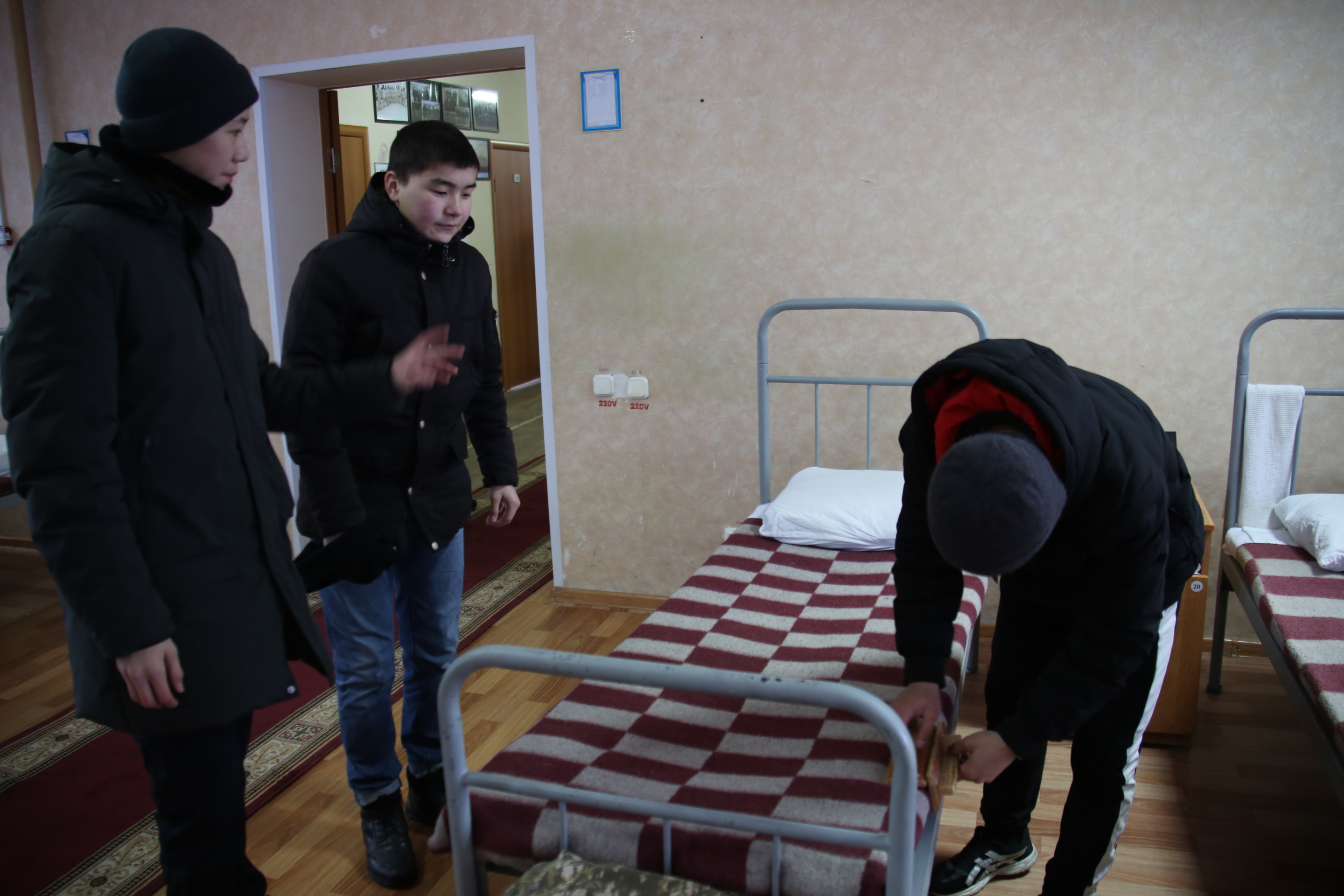 Проводивший экскурсию по казарме сержант 3 класса Пшембаев Каирбек разрешил старшеклассникам примерить на себя бронежилеты и кевларовые каски.