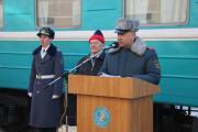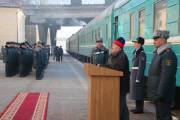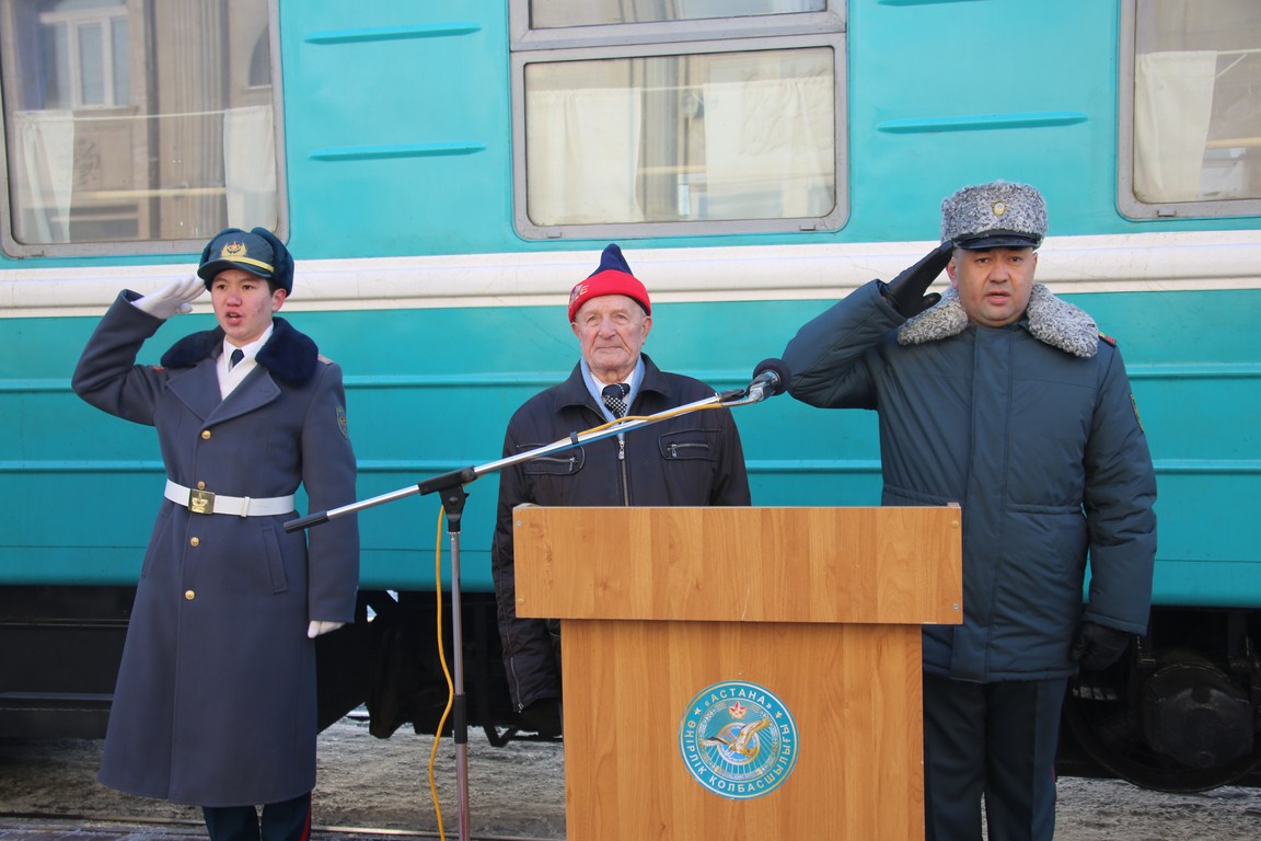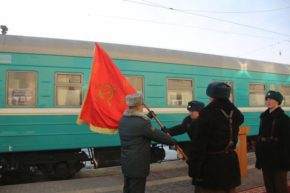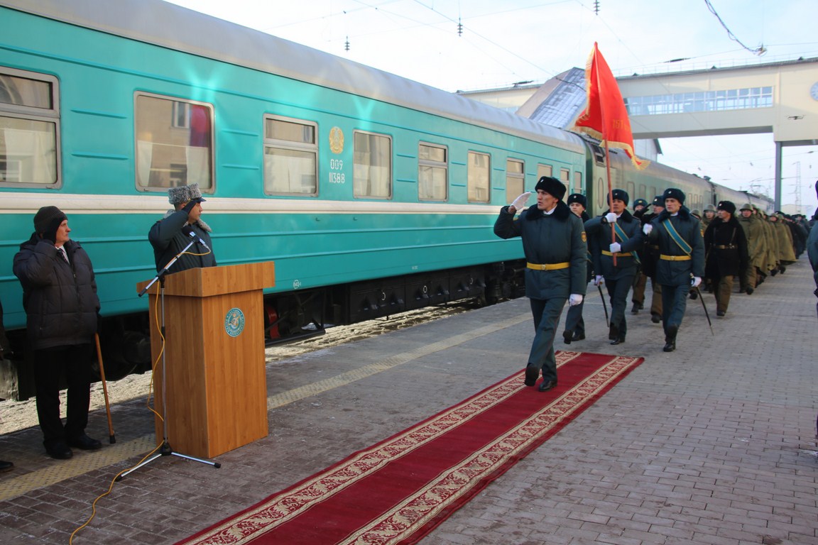 Торжественное встреча Знамени состоялось на ЖД вокзале с участием руководства регионального командования «Астана» и акима города, ветеранов войны и Вооруженных Сил РК, воспитанников «Жас Улан», а также военнослужащих воинской части 31775.