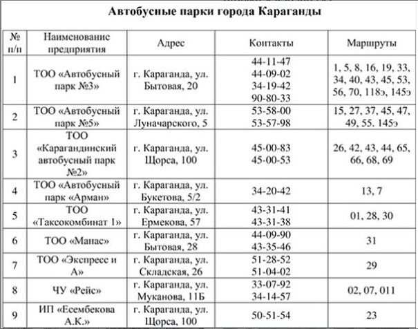 "Уважаемые жители города Караганды! По вопросам культуры обслуживания пассажиров, дисциплины водителей и кондукторов Вы можете обратиться непосредственно в автобусные парки по указанным номерам и адресам".